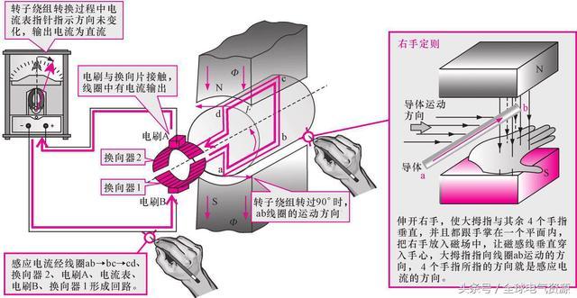 圖4所示為直流發(fā)電機(jī)轉(zhuǎn)子繞組再經(jīng)90°旋轉(zhuǎn)后的工作過程。受外部機(jī)械力作用,轉(zhuǎn)子繞組繼續(xù)旋轉(zhuǎn),這時繞組繼續(xù)做切割磁感線動作,繞組中又可產(chǎn)生感應(yīng)電流,該感應(yīng)電流經(jīng)繞組ab→bc→cd、換向器2、電刷A、電流表、電刷B、換向器1形成回路。